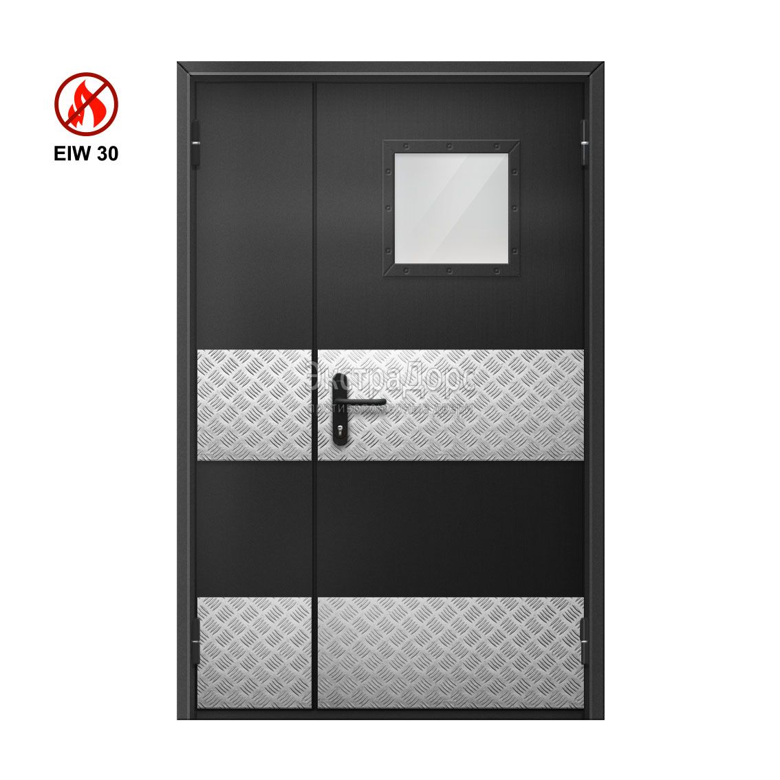 Двупольная противопожарная дверь EIW 30 двустворчатая с выпадающим порогом и стеклом