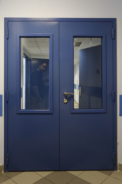 Противопожарная алюминиевая дверь синего цвета в Клине