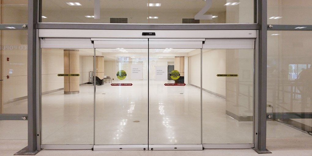 Противопожарная безрамная дверь со стеклом в бизнес центр в Клине