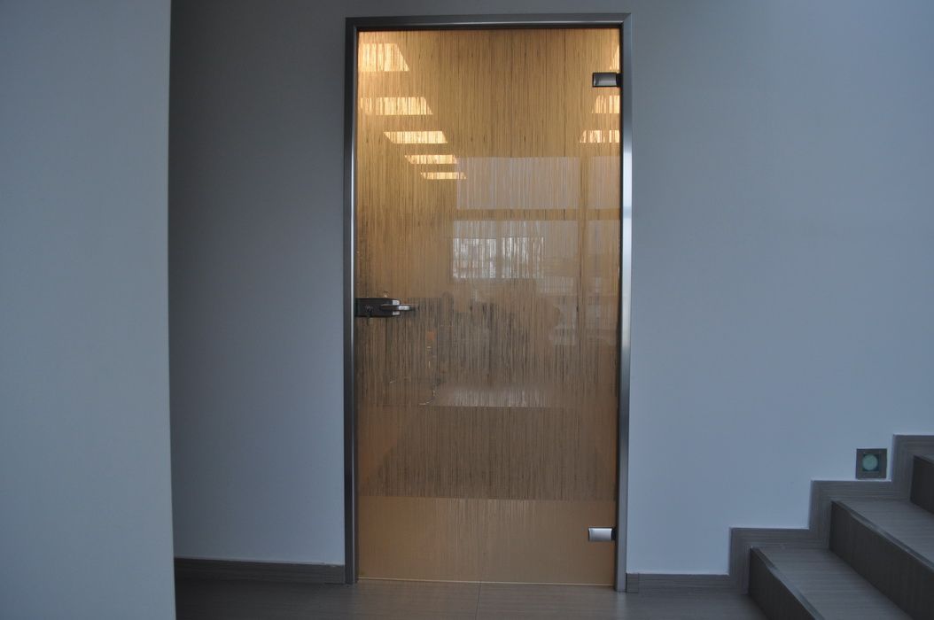 Противопожарная безрамная дверь со стеклом в БЦ в Клине